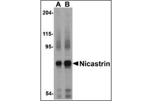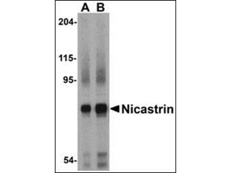 Nicastrin, in addition to presenilin, PEN2, and APH-1 forms the γ-secretase protein complex, a membrane-bound aspartyl protease that can cleave certain proteins at peptide bonds buried within the hydrophobic environment of the lipid bilayer. This cleavage is responsible for a key step in signaling from several cell-surface receptors and is thought to be required for the generation of the neurotoxic amyloid peptides that are central to the pathogenesis of Alzheimer's disease. Like the tumor necrosis factor-a-converting enzyme (TACE) and the b-site cleavage enzyme (BACE) protease families, γ-secretase will cleave the amyloid precursor protein (APP), but within the intramembrane region of APP, resulting in either the non-toxic p3 (from the α and γ cleavage site) or the toxic Aβ amyloid peptide (from the β and γ cleavage site). It is thought that accumulation of the Aβ peptide is the precursor to Alzheimer's disease. Nicastrin is also thought to be involved in cell proliferation and signaling, especially in regards to activation of Notch receptors as loss of Nicastrin expression results in mouse embryonic lethality.Synonyms: KIAA0253, NCSTN, UNQ1874/PRO4317