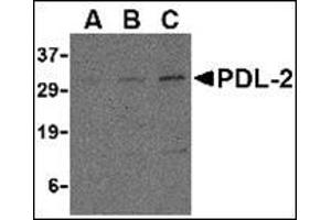 Cell-mediated immune responses are initiated by T lymphocytes that are themselves stimulated by co gnate peptides bound to MHC molecules on antigen-presenting cells (APC). T-cell activation is generally self-limited as activated T cells express receptors such as PD-1 (also known as PDCD-1) that mediate inhibitory signals from the APC. PD-1 can bind two different but related ligands, PDL-1 and PDL-2, both of which are thought act as a negative regulator of T cell activation. However, it has been suggested that PDL-2 can act to stimulate an immunogenic response through and alternative receptor from PD-1. At least three isoforms of PDL-2 are known to exist, this antibody is specific to the largest isoform.Synonyms: B7DC, PD-1-ligand 2, PD-L2, PDCD1 ligand 2, PDCD1L2, PDCD1LG2, Programmed cell death 1 ligand 2, Programmed death ligand 2