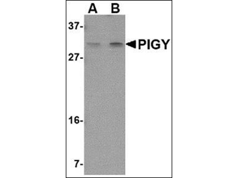 Glycosylphosphatidylinositol (GPI) lipid anchoring is an important post-translational modification of proteins that takes place in the endoplasmic reticulum. The synthesis of GPI is initiated by GPI-N-acetylglucosaminyltransferase (GPI-GnT), a complex of proteins including PIG-A, PIG-H, PIG-C, GPI1, and DPM2. PIG-Y, the mammalian homolog to yeast Eri1p, is also thought to be involved in the biosynthesis of GPI. The PIG-Y gene encodes two proteins, one of which arises from leaky scanning of the mRNA. This antibody only detects isoform 1 of PIG-Y. Despite its predicted molecular weight, PIG-Y often migrates at 28-30 kDa in SDS-PAGE.Synonyms: PIG-Y, Phosphatidylinositol N-acetylglucosaminyltransferase subunit Y, Phosphatidylinositol-glycan biosynthesis class Y protein