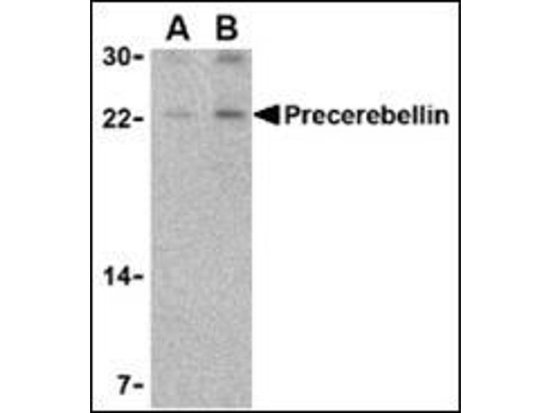 - Precerebellin antibody was raised against a 15 amino acid peptide from the middle of human precerebellin.
