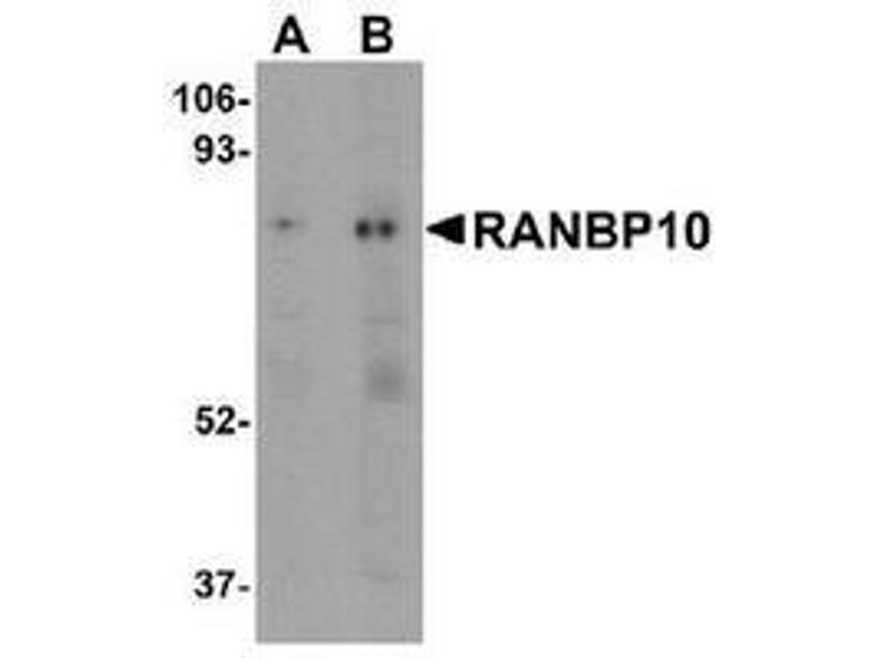 The RAN binding protein 10 (RANBP10) is a cytoplasmic guanine nucleotide exchange factor that shares high sequence similarity to the MET-interacting protein RANBP9. RANBP10 is expressed in the cytoplasm of mature megakaryocytes (MKs) and platelets where it localizes to polymerized noncentrosomal microtubules. RANBP10 possesses guanine nucleotide exchange factor activity towards RAN, a GTPase involved in nucleocytoplasmic traffic, spindle formation at mitosis, and nuclear envelope assembly during telophase, suggesting that RANBP10 may also be involved in these activities. RANBP10 depletion in vitro caused the disturbance of polymerized filaments in MKs and platelets in RANBP10-null mice exhibited disorders in microtubule filament numbers and localization, indicating that RANBP10 may play a significant role in maintaining microtubule dynamics.Synonyms: KIAA1464, Ran-binding protein 10