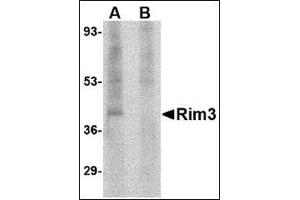 Rab3-interacting molecules (RIMs) are synaptic proteins are synaptic proteins necessary for neural transmission and plasticity. While both Rim1 and Rim 2 are thought to be effector proteins for Rab3, binding to Rab3 on synaptic vesicles in a GTP-dependent manner, less is known of Rim3. Expression of Rim3 in PC12 cells induced a significant increase in calcium-triggered exocytosis, with no appreciable change in the baseline release, suggesting that it plays a role in the regulation of exocytosis. Rim3 protein localizes primarily to neuronal dendrites and the postsynaptic densities, as opposed to Rim1 which is found in presynapse locations, indicating that Rim3 may contribute to synapse transmission and plasticity.Synonyms: KIAA0237, Nim3, RIM 3, RIM3 gamma, Rab-3-interacting molecule 3, Regulating synaptic membrane exocytosis protein 3