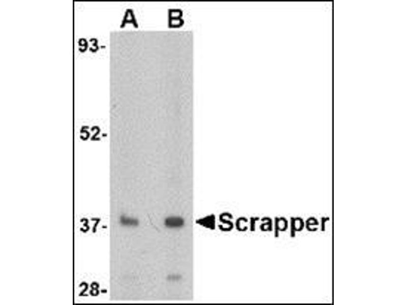 Members of the F-box protein family, such as Scrapper, are characterized by an approximately 40-amino acid F-box motif. SCF complexes, formed by SKP1, cullin, and F-box proteins, act as protein-ubiquitin ligases. Scrapper is selectively expressed in the brain, broadly expressed within the mouse CNS and is abundant at presynaptic membrane. Scrapper has orthologs in C. elegans, D. melanogaster, and mammals which suggests that it might function as an important membrane-localized E3 ligase in various species. Scrapper is a major presynaptic E3 ubiquitin ligase that acts through RIM1a via degradation and the ubiquitin-proteasome-system (UPS) pathway to critically regulate synaptic transmission. This identifies protein degradation as a mechanism for holding synaptic communication in check.Synonyms: F-box and leucine-rich repeat protein 20, F-box/LRR-repeat protein 2-like, F-box/LRR-repeat protein 20, FBL2