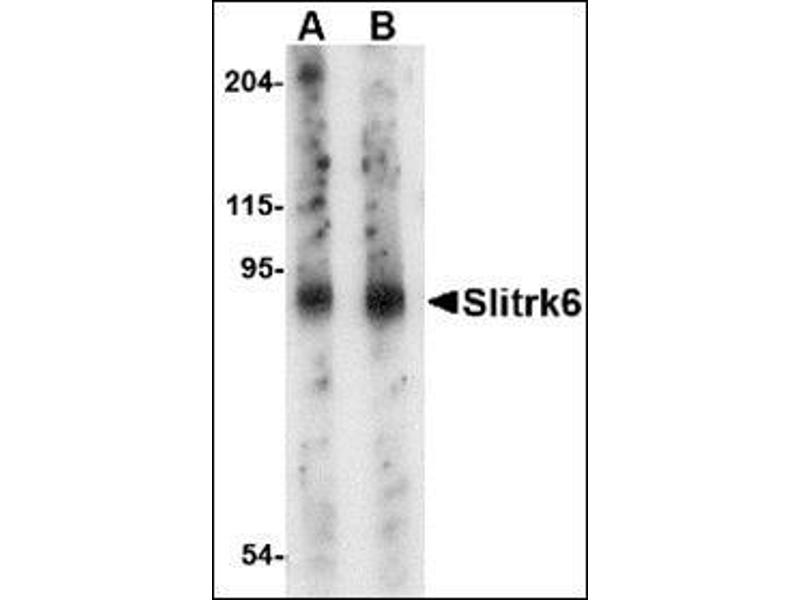 SLIT and NTRK-like family 6 (Slitrk6) is a member a protein family consisting of six homologous transmembrane proteins (Slitrk1-6) that share two conserved leucine-rich repeat domains in the extracellular domain and have significant homology to Slit, a secreted axonal growth-controlling protein. These proteins are also homologous to trk neurotrophin receptors in their intracellular domains. Expression of Slitrk proteins is highly restricted to neural and brain tumor tissues, but varies within the protein family (1,2). Slitrk6 expression has been observed in tissues such as tongue, lung, gastrointestinal tract, and pancreas. Like every other Slitrk protein except Slitrk1, overexpression of Slitrk6 inhibited neurite outgrowth in cultured neurons, suggesting that these proteins are involved in the control of neurite outgrowth. At least two isoforms of Slitrk6 are known to exisit.Synonyms: SLIT and NTRK-like protein 6