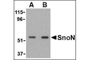 TGF-beta is a ubiquitously expressed cytokine that signals through the Smad protein family to regulate numerous cellular processes such as embryonic development and tumorigenesis. This signaling is negatively regulated by Ski, the mammalian homolog of the transforming protein of an avian retrovirus that induces oncogenic transformation of chicken embryo cells, and the related protein SnoN. Like Ski, SnoN functions by binding to the Smad proteins and preventing their phosphorylation, thereby inhibiting their ability to bind DNA and activate the transcription of downstream genes. SnoN is located primarily in the nucleus in cancer tissues or cells, but in the cytoplasm in normal tissues or primary epithelial cells. There are at least four alternately spliced isoforms of SnoN.Synonyms: SNO, Ski-like protein, Ski-related novel protein N, Ski-related oncogene, Ski-related protein, SnoA, Snol