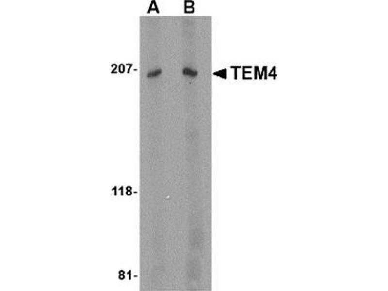 Rho GTPases, which are activated by specific guanine-nucleotide exchange factors (GEFs), play pivotal roles in several cellular functions. TEM4, encoding a protein containing 1510 amino acids, contains a RhoGEF-specific Dbl homology (DH) domain but lacks their typical pleckstrin homology domain. TEM4 is a Rho-specific GEF with novel structural and regulatory properties and predominant expression in the heart. It couples tyrosine kinase signals with the activation of the rho/rac GTPases, thus leading to cell differentiation and/or proliferation. Elevated levels of TEM4, TEM5, TEM6, TEM7 and TEM7R were also raised in breast cancer tissues. TEM4 could also prove to be useful targets therapeutically.Synonyms: 164 kDa Rho-specific guanine-nucleotide exchange factor, KIAA0337, Rho guanine nucleotide exchange factor 17, Tumor endothelial marker 4, p164-RhoGEF, p164RhoGEF