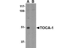 Actin reorganization is important for the regulation of neuronal morphology. A protein involved in this process, the transducer of cdc42-dependent actin assembly 1 (TOCA-1) protein, a member of the evolutionarily conserved pombe CDC15 homology (PCH) protein family, is an essential component of the Cdc42 pathway. TOCA-1 binds both N-WASP and Cdc42 and is essential for Cdc42- and PIP2-induced actin polymerization, suggesting that TOCA-1 mediates Cdc42-dependent actin nucleation by activating the N-WASP-WIP complex. Decreased expression of TOCA-1 significantly enhances neurite elongation in PC-12 cells, its overexpression in the same cells suppresses neurite elongation. It has been suggested that TOCA-1 negatively regulates axon branching by regulating membrane trafficking by regulating membrane trafficking through the F-BAR/EFC domain. Multiple isoforms of TOCA-1 are known to exist.Synonyms: C1orf39, Formin-binding protein 1-like, TOCA1, Transducer of Cdc42-dependent actin assembly protein 1