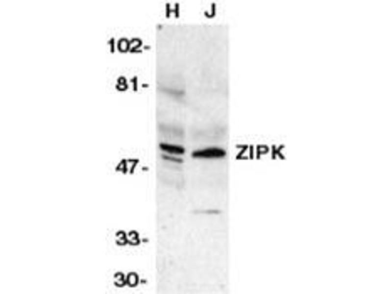 Apoptosis is mediated by death domain containing adapter molecules and a caspase family of proteases. Certain serine/threonine protein kinases, such as ASK-1 and RIP, are mediators of apoptosis. A novel serine/threonine kinase that mediates apoptosis was recently identified and designated ZIP kinase . ZIP kinase contains an N-terminal kinase domain and a C-terminal leucine zipper structure and binds to ATF4 that is a member of ATF/CREB family. ZIP kinase has high sequence homology to DAP kinase (death-associated protein kinase), which is a mediator of apoptosis induced by gamma interferon. Overexpression of ZIP kinase induces apoptosis. ZIP and DAP kinases represent a novel kinase family, which mediates apoptosis through their catalytic activities. The messenger RNA was ubiquitously expressed in various tissues .Synonyms: DAP kinase 3, DAP-like kinase, DLK, Death-associated protein kinase 3, ZIP-kinase