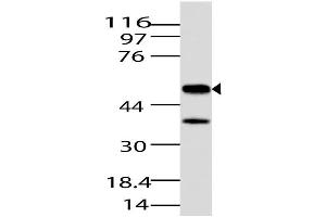 JMJD5 (Jumonji domain-containing protein 5) or commonly called as Lysine-specific demethylase 8 is a histone lysine demethylase that specifically demethylates dimethylated Lys 36 of histone H3 (H3K36me2) thereby activating the target gene. JMJD5 is important for G2/M phase cell cycle progression. JMJD5 is also a potential tumor suppression protein. JMJD5 helps in regulation of cancer proliferation by regulating cyclin-A1. JMJD5 has three isoforms (47, 24, 50 kDa), all localized in nucleus. JMJD5 is weakly expressed in most normal cells but highly expressed in breast cancer cells.