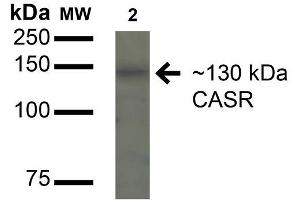 A 1:1000 dilution of ABIN5066819 was sufficient for detection of calcium-sensing receptor (CASR) in 15 μg of Human HeLa Cell Lysates by ECL immunoblot analysis using goat anti-rabbit IgG:HRP as the secondary antibody.