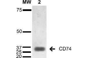 A 1:1000 dilution of ABIN5067038 was sufficient for detection of CD74 in 15 μg of B-Cell Lymphoma cell line Raji by ECL immunoblot analysis using Goat Anti-Mouse IgG:HRP as the secondary Antibody.