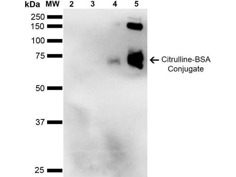 - Specific for citrulline residues on modified proteins. Tested using citrulline conjugated Bovine Serum Albumin (BSA).