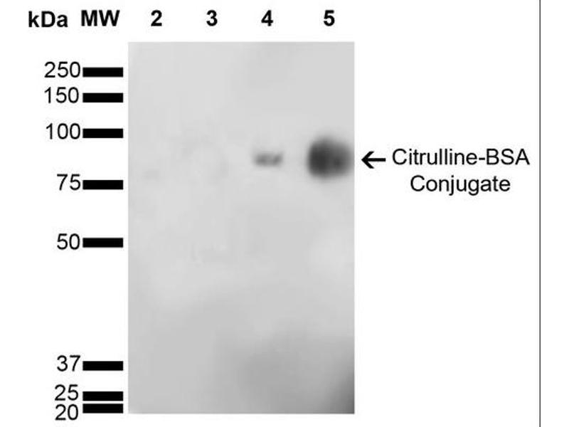 A 1:1000 dilution of ABIN5067125 was sufficient for detection of Citrulline in 2 μg of Citrulline conjugated to BSA by ECL immunoblot analysis using Goat Anti-Mouse IgG:HRP as the secondary Antibody.