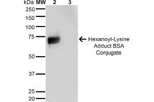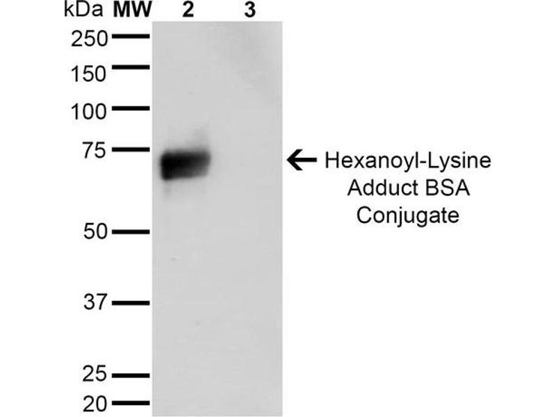 A 1:1000 dilution of ABIN5067257 was sufficient for detection of Hexanoyl Lysine adduct in 0.5 μg of Hexanoyl Lysine conjugated to BSA by ECL immunoblot analysis using Goat Anti-Mouse IgG:HRP as the secondary Antibody.