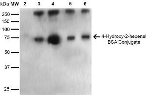 A 1:1000 dilution of ABIN5067272 was sufficient for detection of 4-Hydroxy-2-hexenal in 0.5 μg of 4-Hydroxy-2-hexenal conjugated to BSA and 4-Hydroxy nonenal conjugated to BSA by ECL immunoblot analysis using Goat Anti-Mouse IgG:HRP as the secondary Antibody.