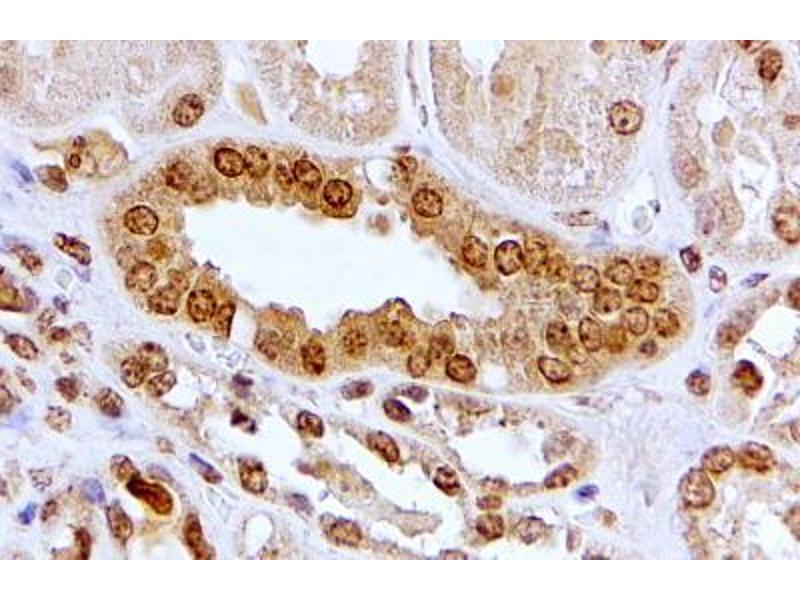 Immunohistochemistry: In paraffin embedded Human Kidney shows both cytoplasm and nuclear staining in DCT. Recommended concentration: 2-4 μg/mL.