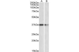 Western Blot: Approx 37 kDa band observed in lysates of cell line HeLa and in rodent Brain lysates (calculated MW of 37.2 kDa according to NP_001229793.1). Approx 35 kDa band observed in Pig Brain lysates (calculated MW of 38.7 kDa according to XP_005658963.