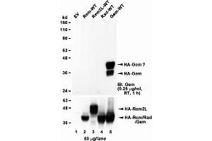 Western Blot: In transfected HEK293 transiently expressing Human recombinant GEM bands of approx. 35+45 kDa are observed. These bands are not observed in the transfected HEK293 with empty vector and the antibody does not cross-react to related protein s