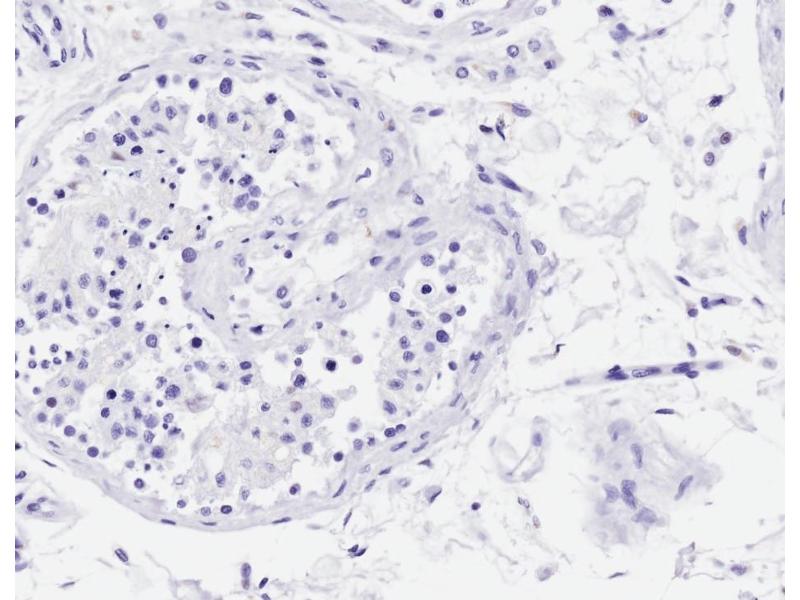 Immunohistochemistry: Paraffin embedded Human Testis. Recommended concentration: 4 μg/mL.