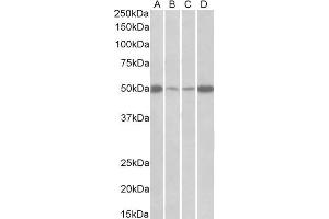 Western Blot: Approx 50 kDa band observed in lysates of cell lines Daudi and Jurkat (calculated MW of 50.5 kDa according to NP_001949.1). The same band is observed in lysates of Mouse and Rat Heart and Skeletal Muscle. Recommended concentration: 0.5-2 μg/mL