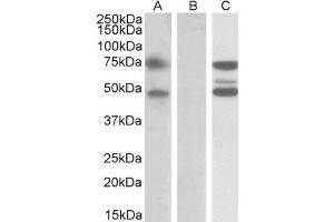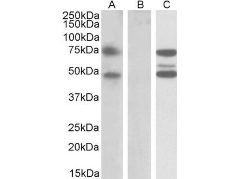 Western Blot: In transfected HEK293 transiently expressing full-length Human ASNSD1 (myc and DYKDDDDK tagged), a band of approx. 75 kDa was observed. No bands were observed in mock-transfected HEK293 and the same band was observed using anti-myc tag antib