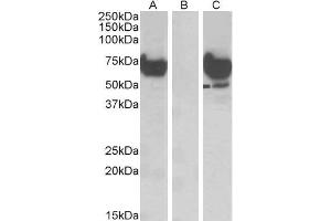 Western Blot: In transfected HEK293 transiently expressing full-length Human EPM2AIP1 (myc and DYKDDDDK tagged), a band of approx. 70 kDa was observed. No bands were observed in mock-transfected HEK293 and the same band was observed using anti-DYKDDDDK ta