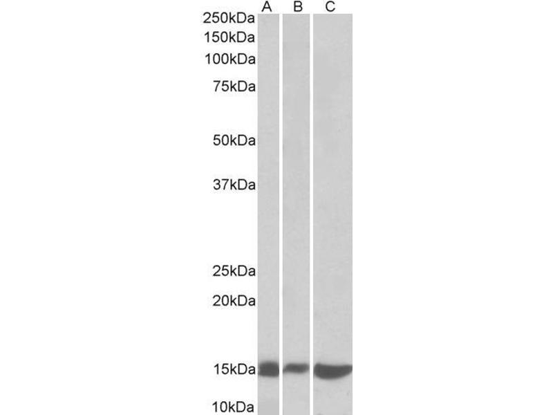 Western Blot: Approx 15 kDa band observed in lysates of Mouse and Rat Pancreas and of cell line NIH3T3 (calculated MW of 14.9 kDa according to NP_032521.1). Recommended concentration: 0.1-0.3 μg/mL.