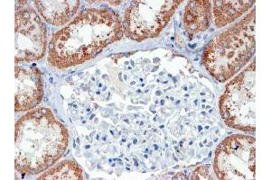 Immunohistochemistry: In paraffin embedded Human Kidney shows textured cytoplasm staining in the convoluted tubules. Recommended concentration, 4-6 μg/mL.