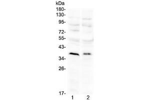 - Optimal dilution of the ATOH1 antibody should be determined by the researcher.\. Western Blot: 0.5-1 μg/mL