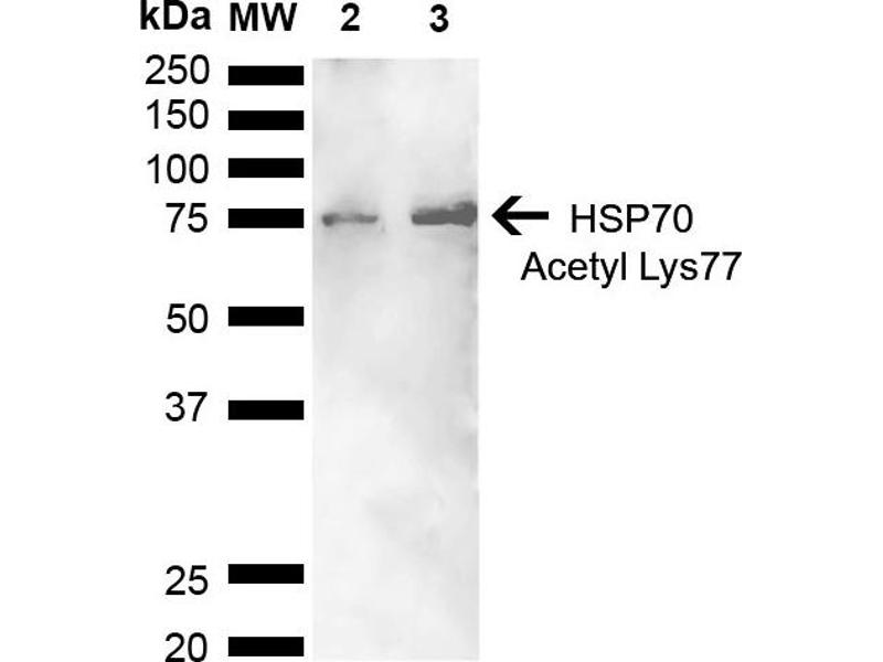 - Binds to acetylated lysine 77 on HSP70. Detects 70 kDa band.