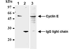 - This antibody reacts with Cyclin E (50 kDa) on Imunoprecipitation.