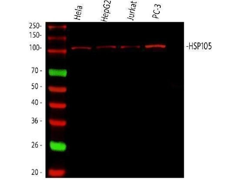 Background: HSP105 (HEAT-SHOCK 105/110-KD PROTEIN 1), also called HSPH1 or HSP110, is a protein that in humans is encoded by the HSPH1 gene. Immunohistochemical analysis localizes HSP105 mainly in the cytoplasm. Database analysis indicates that both HSP105 isoforms are highly conserved during evolution. By analysis of radiation hybrids and human/rodent hybrid cell lines, the HSPH1 gene is mapped to chromosome 13. Both HSP105-alpha and HSP105-beta are upregulated in HeLa cells exposed to heat shock. HSP105-alpha, but not HSP105-beta, is also upregulate in response to other cell stresses. Following heat shock, HSP105 relocalizes from a cytoplasmic to perinuclear position. Besides, HSP110 may thus constitute a major determinant for both prognosis and treatment response in colorectal cancer.