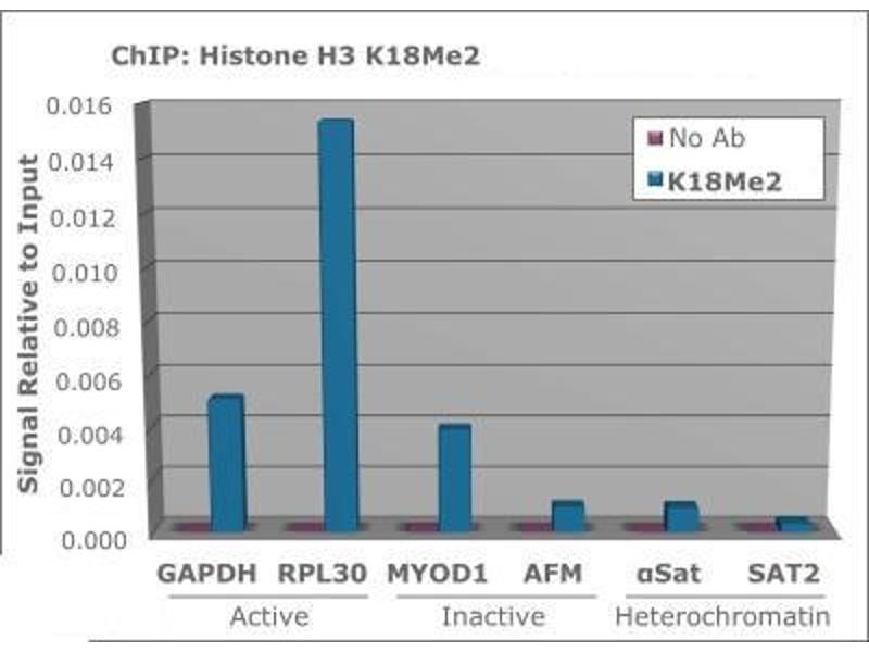 Immunogen: Histone H3 [Dimethyl Lys18] affinity purified antibody was prepared from whole rabbit serum produced by repeated immunizations with a synthetic dimethylated peptide surrounding Lysine 18 of human Histone H3.2.