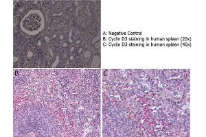Application Note: This affinity purified antibody has been tested for use in ELISA, immunohistochemistry, flow cytometry, and by immunoprecipitation. Specific conditions for reactivity should be optimized by the end user. Expect a band approximately 32.4 kDa in size corresponding to Cyclin D3 protein by western blotting in the appropriate stimulated tissue or cell lysate or extract. ELISA and western blot show equivalent reactivity against phosphorylated and non-phosphorylated Cyclin D3.