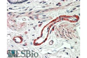 Immunohistochemistry: In paraffin embedded Human Colon shows endothelial cell staining of a blood vessel. Recommended concentration, 1-2 μg/mL.