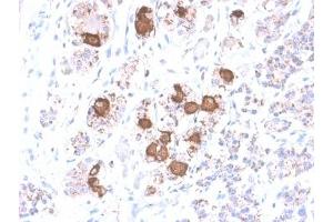 ACTH (same as Corticotropin) is a 39 amino acid active peptide produced by the anterior pituitary. This mAb is specific to CLIP (aa 17-39 of ACTH) and does not react with Synacthen (aa 1-24 of ACTH). POMC (pro-opiomelanocortin or corticotropin-lipotropin) is a 267 amino acid polypeptide hormone precursor that goes through extensive, tissue-specific posttranslational processing by convertases. POMC is cleaved into ten hormone chains named NPP, ACTH, alpha-MSH (Melanocyte Stimulating Hormone), beta-MSH, gamma-MSH, CLIP (corticotropin-like intermediary peptide), Lipotropin-beta, Lipotropin-gamma, beta-endorphin and Met-enkephalin. ACTH is also produced by cells of immune system (T-cells, B-cells, and macrophages) in response to stimuli associated with stress. Anti-ACTH is a useful marker in classification of pituitary tumors and the study of pituitary disease. It reacts with ACTH-producing cells (corticotrophs). It also may react with other tumors (e.g. some small cell carcinomas of the lung) causing paraneoplastic syndromes by secreting ACTH.