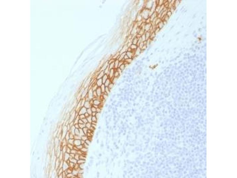 This antibody recognizes an epitope encoded by exon v9 on the variant portion of human CD44. The CD44 Molecule belongs to a family of cellular adhesion molecules found on a wide range of normal and malignant cells in epithelial, mesothelial and hemopoiesis tissues. CD44 is a single gene with 20 exons, of which 10 are normally expressed to encode the basic CD44 (H-CAM) molecule. The additional 10 exons (v1 to v10) are only expressed by alternative splicing of the nuclear RNA. The expression of specific cell adhesion molecule CD44 splice variants has been reported to be associated with metastasis in certain human malignancies.