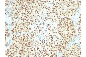 1. The prediluted format is supplied in a dropper bottle and is optimized for use in IHC. After epitope retrieval step (if required), drip mAb solution onto the tissue section and incubate at RT for 30 min.\. Immunohistochemistry (FFPE): 0.5-1 μg/mL for 30 min at RT,Prediluted IHC only format: incubate for 30 min at RT (1) -