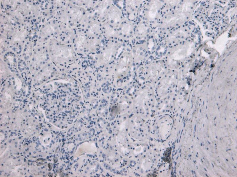 Immunohistochemistry: Paraffin embedded Human Kidney. Recommended concentration: 6-8 μg/mL.