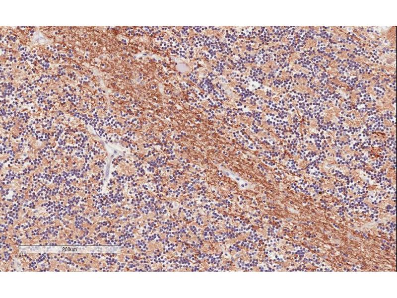 Immunohistochemistry: In paraffin embedded Human Cerebellum shows strong staining of axonal bundles through the granular layer. Recommended concentration: 1-2 μg/mL. Paraffin embedded Human Cortex. Recommended concentration: 3.75 μg/mL.