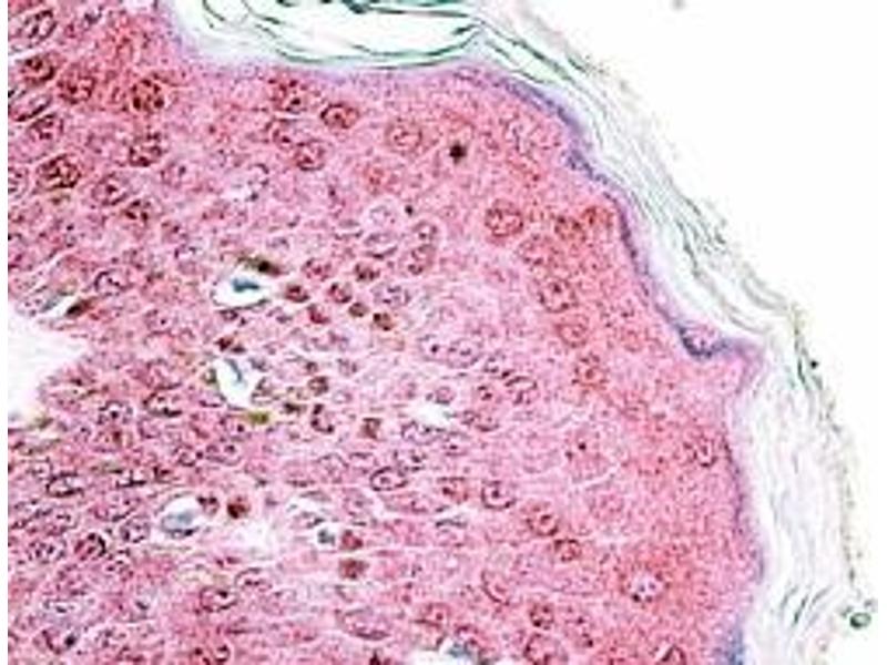 Immunohistochemistry: In paraffin embedded Human Skin shows staining of subnuclear structures and cytoplasm in keratinocytes. Recommended concentration: 3.75 μg/mL.