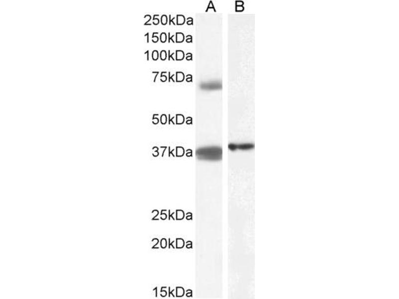 Western Blot: Approx 37 kDa band observed in Human Peripheral Blood Mononucleocytes (PBM) and in lysates of cell lines HeLa. An additional 70 kDa band was seen in some PBM lysates (calculated MW of 37.3 kDa according to NP_001317311.1 (isoform 2) and 65.8