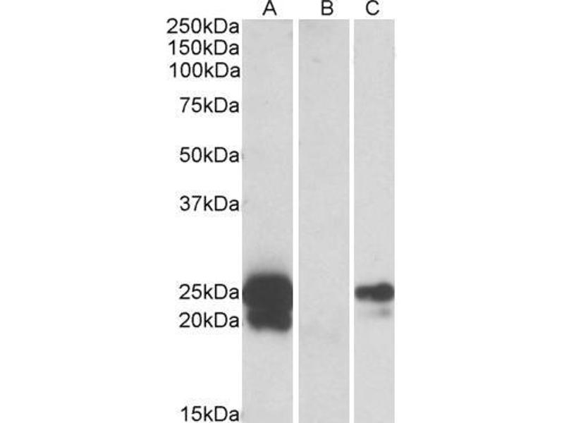Western Blot: Approx 25 kDa band observed in Human Testis lysates (calculated MW of 13 kDa according to NP_006094.3). The observed molecular weight corresponds to earlier findings with different antibodies from other commercial sources. Recommended concen