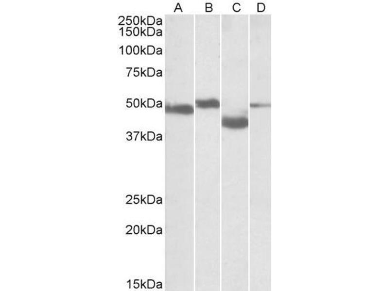 Western Blot: Approx 50 kDa bands observed in Rat Brain and Rat Thymus lysates, 48 kDa band in Mouse Brain and 40 kDa in Mouse Thymus (calculated MW of 51.8 kDa according to Human NP_733775.1 and Mouse NP_001153040.1, and of 43.7 kDa according to Mouse NP_0