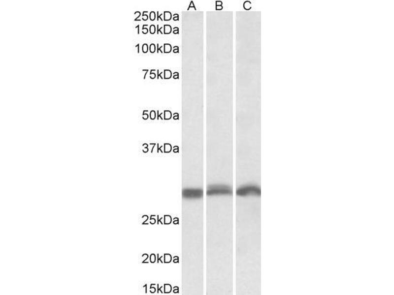 Western Blot: Approx 28 kDa band observed in lysates of cell lines K562, NIH3T3 and in lysates of Human Tonsil, Human Peripheral Blood Mononucleocytes and in Mouse and Rat Spleen (calculated MW of 29.5 kDa according to NP_002780.1). Recommended concentrati