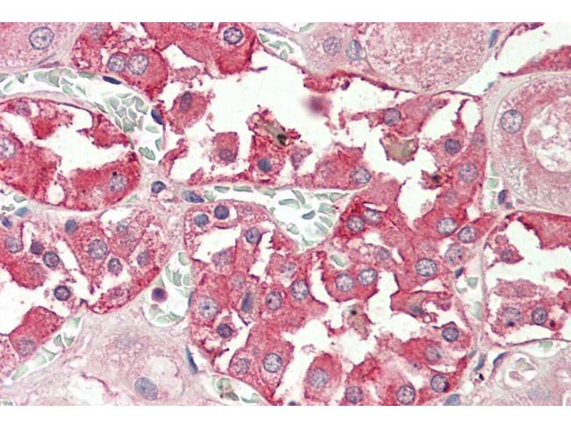 Western Blot: Approx 60 kDa band observed in Human Testis lysates (calculated MW of 53.2 kDa according to NP_057405.1). The observed molecular weight corresponds to earlier findings in literature with different antibodies (Liu et al, J Biol Chem. 2000 Aug