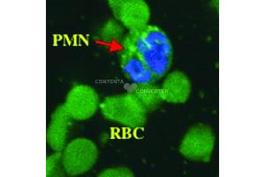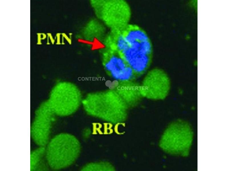 Western blotting, 1:1,000 AbX™ Anti-Cysteine Mouse Monoclonal ImmuNOhIstOChemIstry Porcine peripheral red blood cells were paraffin embedded and sectioned. 4 μm sections were de-paraffinized and rehydrated. Sections were incubated with or without additional thiol compounds and anti-cysteine anti- body for 2 hours at room temperature. Antibody concentration was 3 μg/mL. Sections were blocked pre- and post antibody treatements with 1 % BSA in PBS. Development was with a goat anti-mouse IgG antibody labeled with Alexa™ 488. RBC + Anti-Cysteine RBC + Anti-Cysteine + 20 mM Cysteine Cysteine addition was carried out at 20 mM in 1 % BSA in PBS and added with the monoclonal anti-cysteine antibody at 3 μg/mL for 1 hour at room temperature. With polymorphonuclear neutrophils addition of 20 mM cytseine reduced or eliminated the goat anti-mouse IgG-Alexa 488 signal PMN + Anti-Cysteine PMN + Anti-Cysteine + 20 mM Cysteine Nuclear staining was carried out with TOPRO at 1:500 dilution in PBS. -
