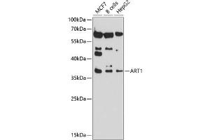 ADP-ribosyltransferase catalyzes the ADP-ribosylation of arginine residues in proteins. Mono-ADP-ribosylation is a posttranslational modification of proteins that is interfered with by a variety of bacterial toxins including cholera, pertussis, and heat-labile enterotoxins of E. coli. The amino acid sequence consists of predominantly hydrophobic N- and C-terminal regions, which is characteristic of glycosylphosphatidylinositol (GPI)-anchored proteins. This gene was previously designated ART2.,ART1,ART2,ARTC1,CD296,RT6,Epigenetics & Nuclear Signaling,Immunology & Inflammation,CD markers,ART1