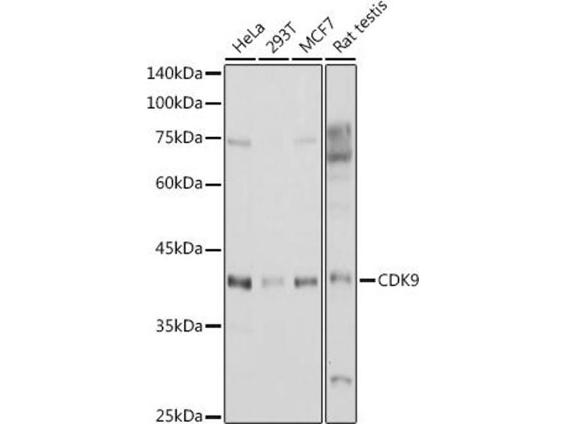 The protein encoded by this gene is a member of the cyclin-dependent protein kinase (CDK) family. CDK family members are highly similar to the gene products of S. cerevisiae cdc28, and S. pombe cdc2, and known as important cell cycle regulators. This kinase was found to be a component of the multiprotein complex TAK/P-TEFb, which is an elongation factor for RNA polymerase II-directed transcription and functions by phosphorylating the C-terminal domain of the largest subunit of RNA polymerase II. This protein forms a complex with and is regulated by its regulatory subunit cyclin T or cyclin K. HIV-1 Tat protein was found to interact with this protein and cyclin T, which suggested a possible involvement of this protein in AIDS.,CDK9,C-2k,CDC2L4,CTK1,PITALRE,TAK,Epigenetics & Nuclear Signaling,Signal Transduction,Kinase,Serine/threonine kinases,Cell Biology & Developmental Biology,Cell Cycle,Immunology & Inflammation,CDK9