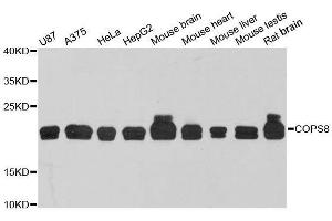 - The protein encoded by this gene is one of the eight subunits of COP9 signalosome, a highly conserved protein complex that functions as an important regulator in multiple signaling pathways. The structure and function of COP9 signalosome is similar to that of the 19S regulatory particle of 26S proteasome. COP9 signalosome has been shown to interact with SCF-type E3 ubiquitin ligases and act as a positive regulator of E3 ubiquitin ligases. Alternatively spliced transcript variants encoding distinct isoforms have been observed.,COPS8,COP9,CSN8,SGN8,Signal Transduction,Kinase,Cell Biology & Developmental Biology,Ubiquitin,Immunology & Inflammation,Stem Cells,Germline Stem Cells,COPS8
